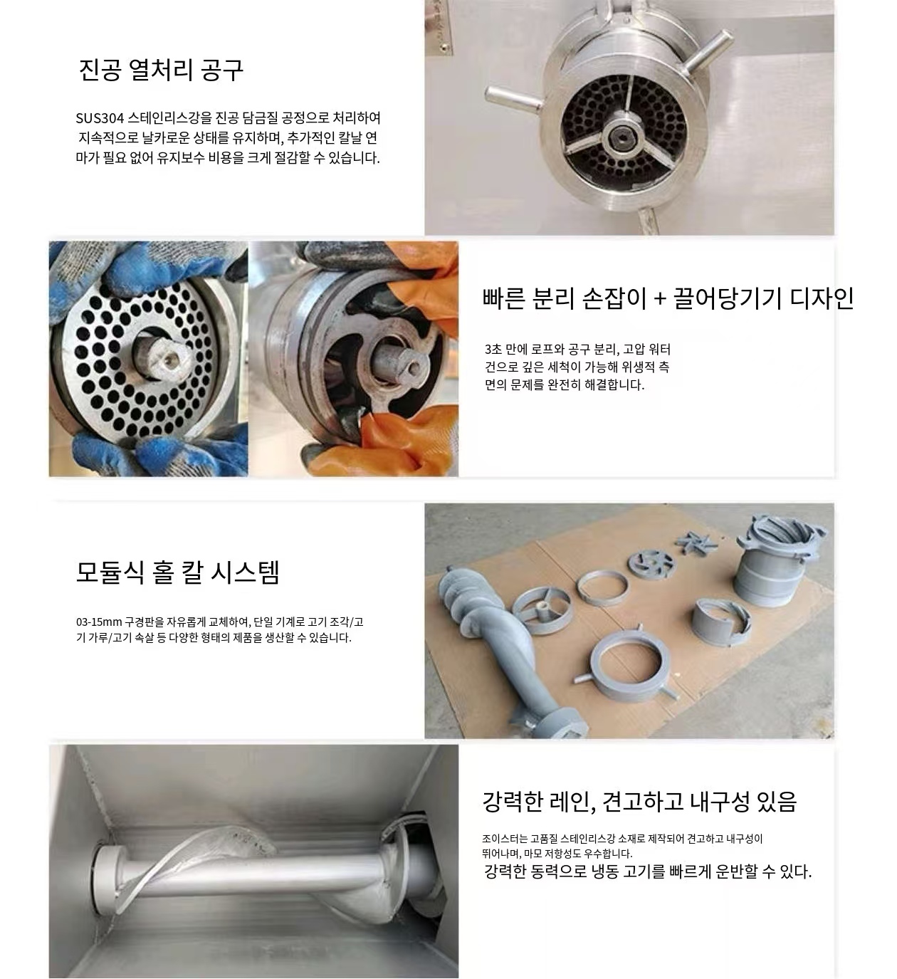 전체 기계는 식품 등급 스테인리스 스틸로 만들어졌으며 육류와 접촉하는 부품은 분해 및 세척이 가능하며 위생 사각지대가 없으며 식품 공장의 생산 사양 요구 사항을 충족합니다.